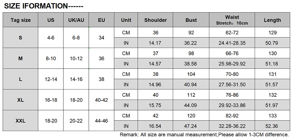 Note:1. Asian sizes are 1 to 2 sizes smaller than European and American people. Choose the larger size if your size between two sizes. Please allow 2-3cm differences due to manual measurement. 2. Please check the size chart carefully before you buy the item, if you don't know how to choose size, please contact our customer service. 3.As you know, the different computers display colors differently, the color of the actual item may vary slightly from the following images.