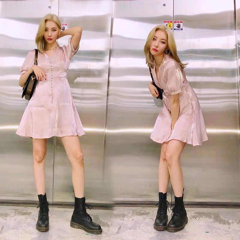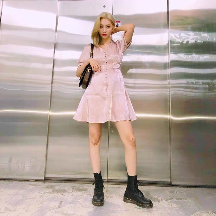 V-neck pink satin small high waist dress