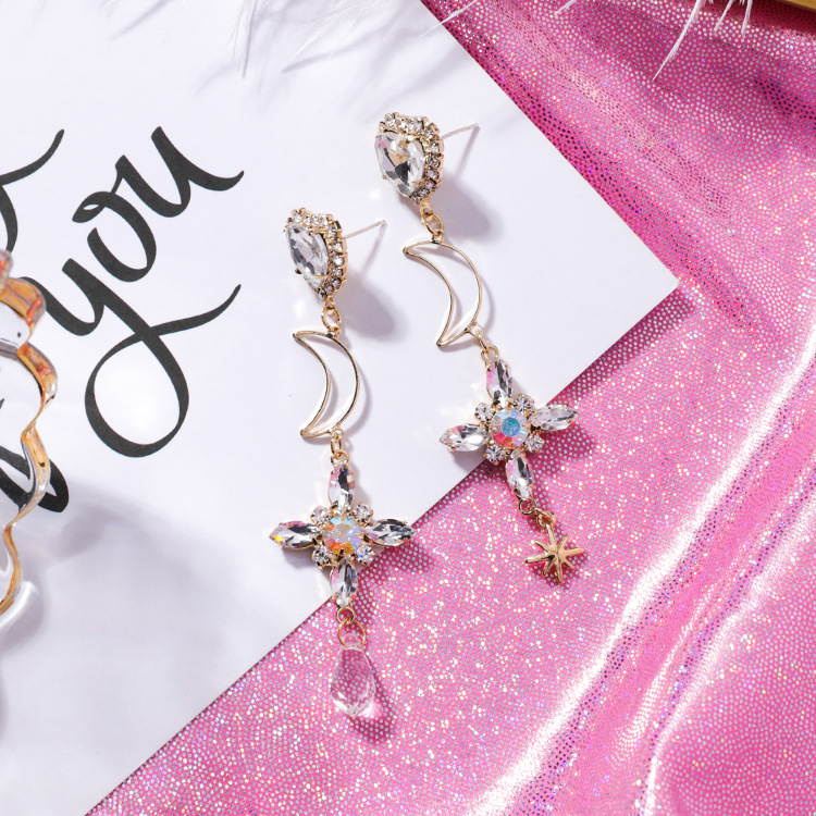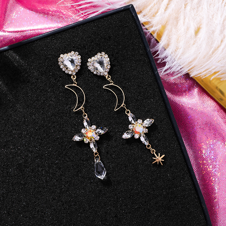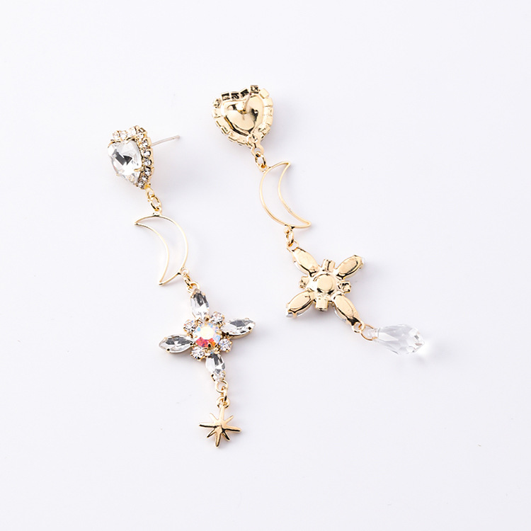 925 silver needle temperament cross moon long earrings personality asymmetric tassel small earrings female Baroque