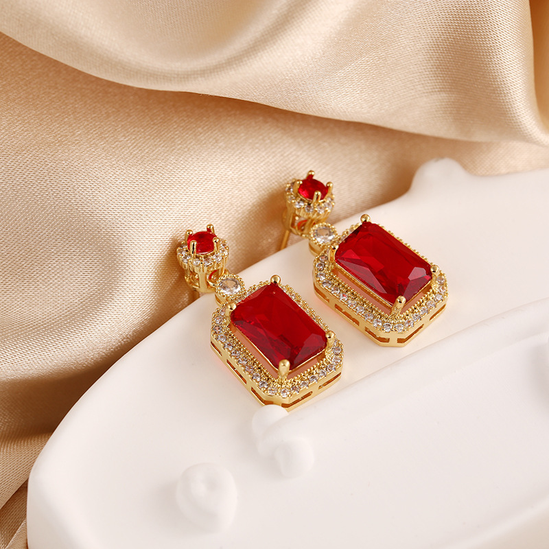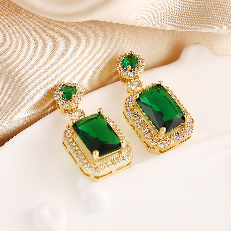 Internet Celebrity Rectangular Full Diamond Green Zircon Stud Earrings High-grade 925 Silver