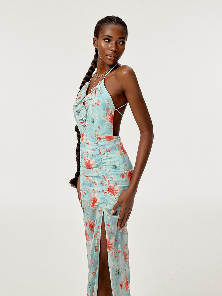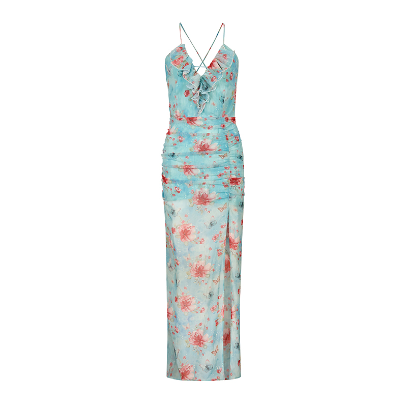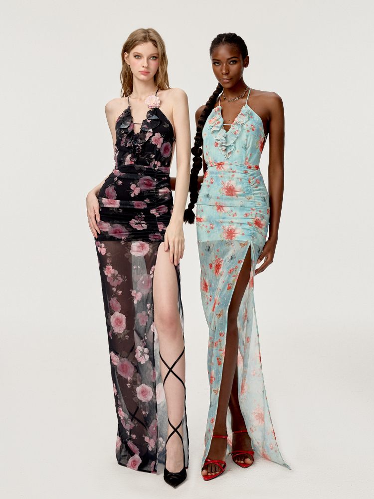 Product information: Material composition: 100% polyester fiber Style: Sling dress Collar type: Lead Profile: Type A Pattern: Floral Size: S,M,L Color classification: Black of Phantom, clear blue color, black and pink color
