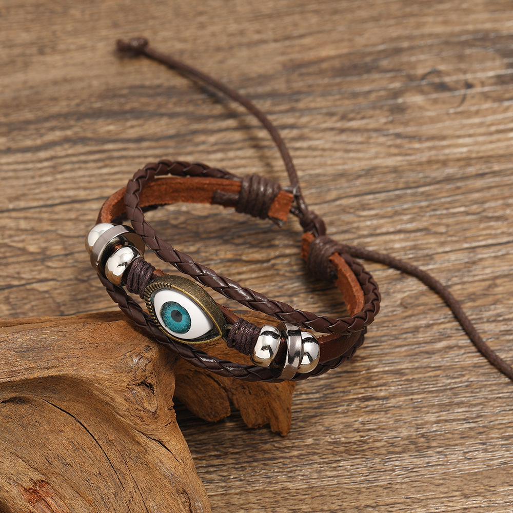 Vintage Alloy Eyes Cowhide Bracelet PU Braided Beaded Bracelet