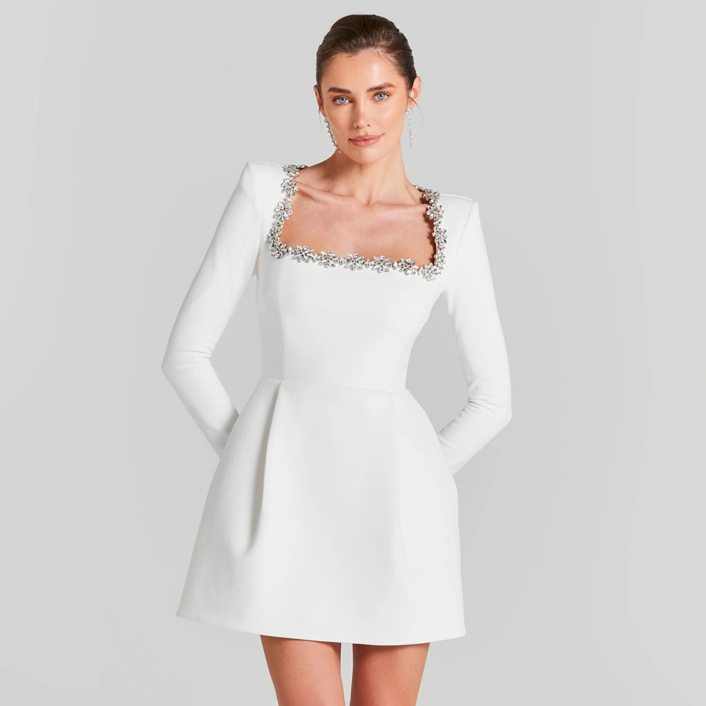 Color: White Size: XS,S,M,L Style type: private clothing socialite Popular elements: Metal Decoration Style: Basic Fabric name: Polyester Style: sexy style Craft: collage/stitching
