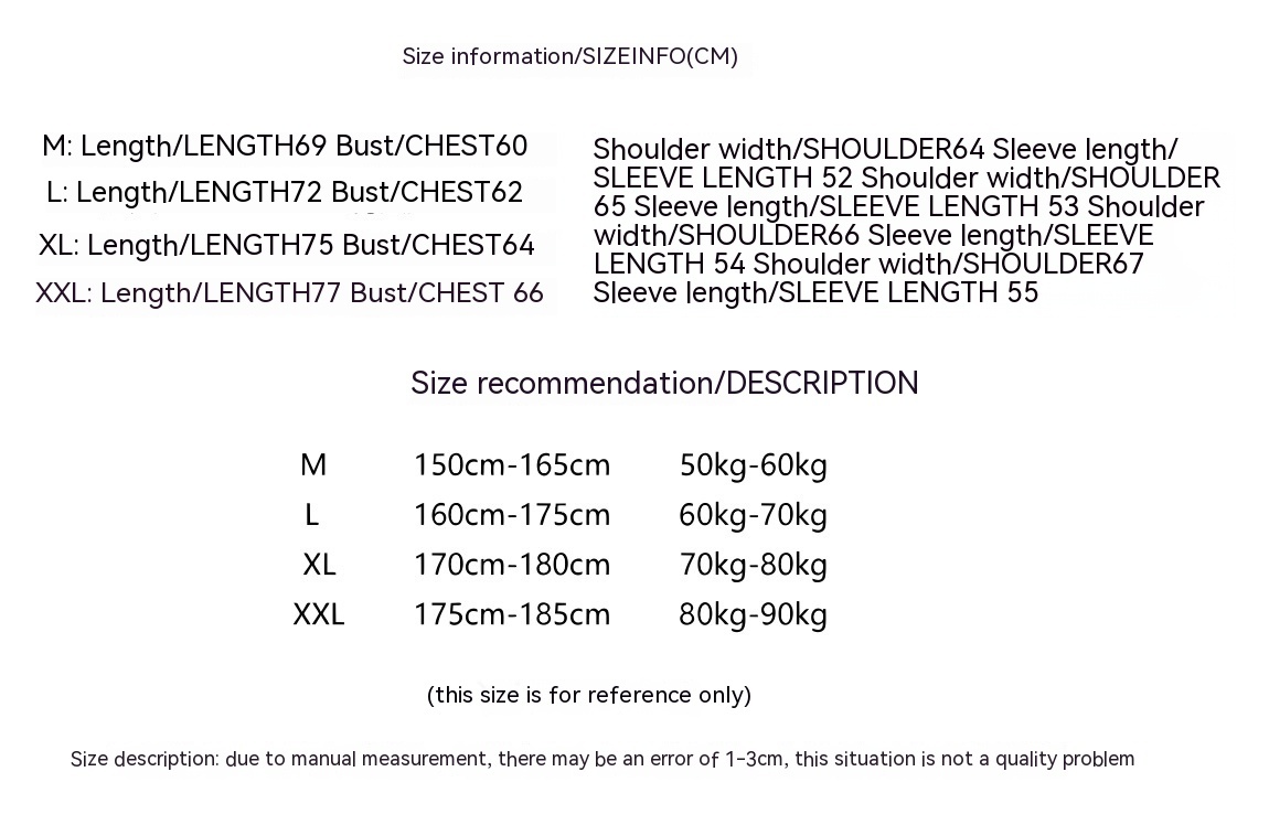 1. Asian sizes are 1 to 2 sizes smaller than European and American people. Choose the larger size if your size between two sizes. Please allow 2-3cm differences due to manual measurement. 2. Please check the size chart carefully before you buy the item, if you don't know how to choose size, please contact our customer service. 3.As you know, the different computers display colors differently, the color of the actual item may vary slightly from the following images.