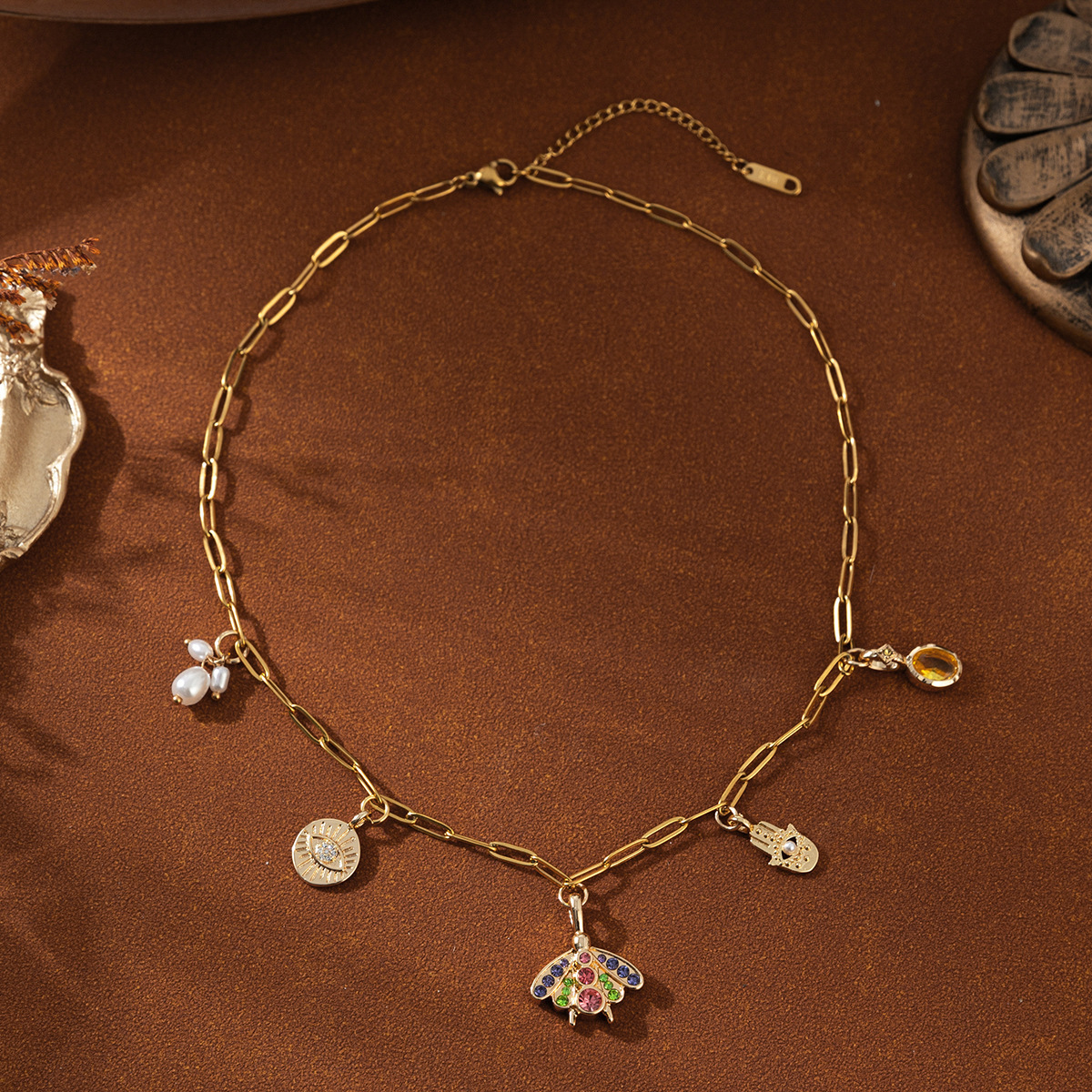Color: Moth individual pendant, yellow zircon pendant, Palm individual pendant, round eye pendant, 3 pearl pendants, clip chain
