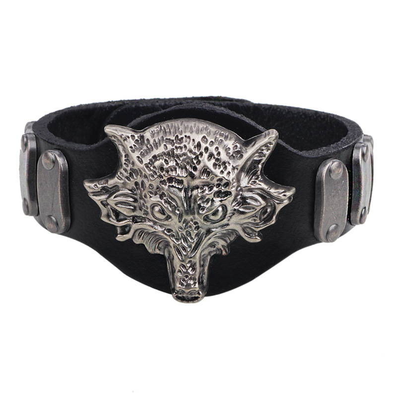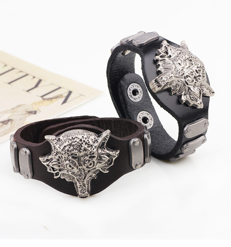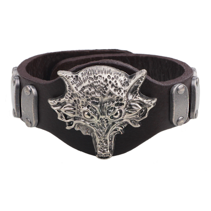 Material: AlloyTreatment process: electroplatingStyle: Men'sModeling: AnimalPackaging: Individually packedColor: coffee + ancient silverSize: Diameter 7 Length 23 * Width 4.2CMPacking list: 1*Bracelet