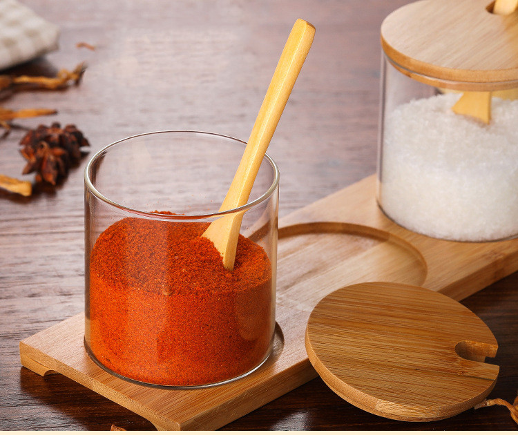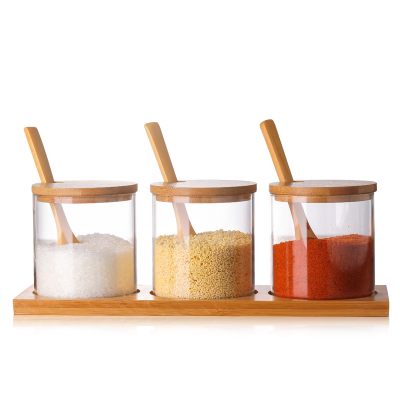 Name: Three-piece seasoning jarCapacity: high borosilicate glass + natural bambooAccessories: single can 300mlScope of application: salt sugar, MSG, chilli noodles, etc.Dimensions: diameter 8cm, height 9cm(subject to actual measurement)