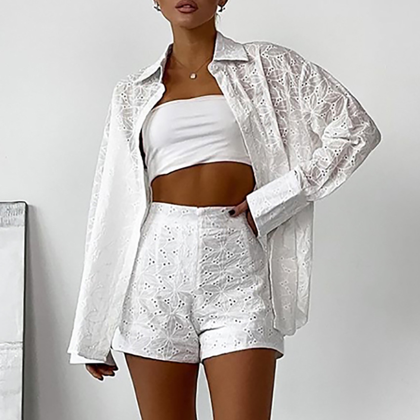 Product information: Color: White Pants length: Shorts Main fabric composition: Cotton Size: S,M,L Applicable Gender: Female Sleeve length: long sleeve Popular elements: Button Craft: collage/stitching (Unit: cm)
