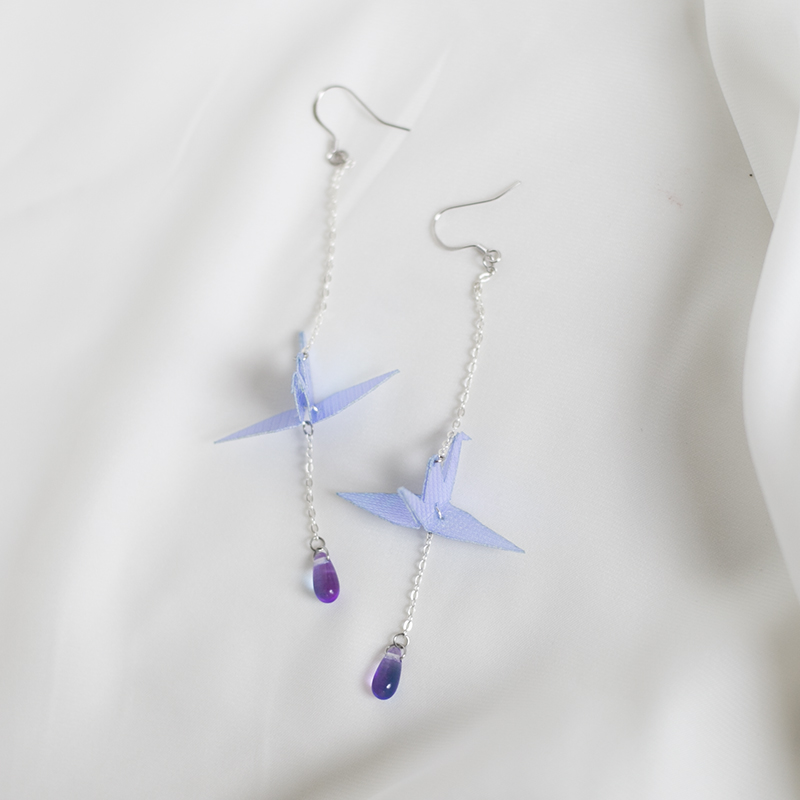 Material: 925 sterling silver ear hook / stainless steel invisible ear clipLaser waterproof paperImported gradient water dropColor-preserving copper chainDesign: Blue-violet gradient and laser reflective paper cranes