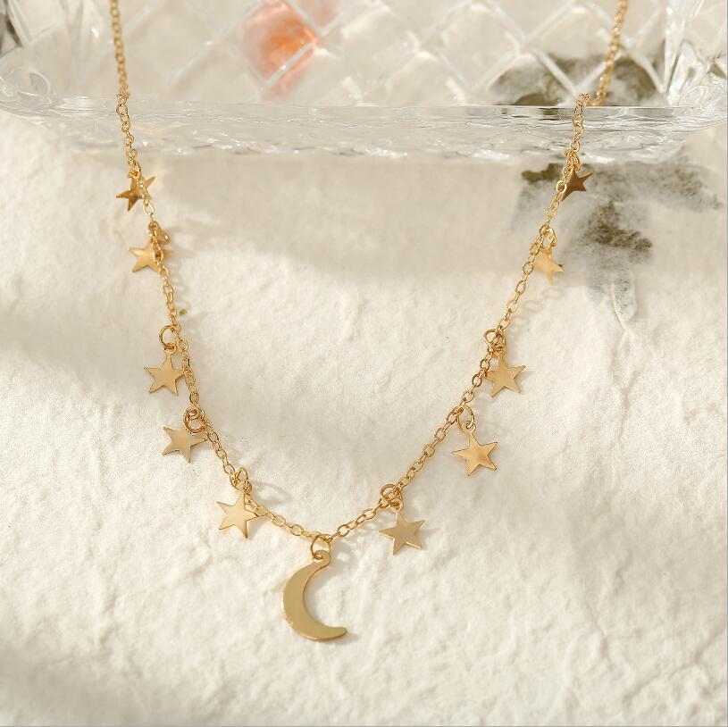 Product informationMaterial: AlloyStyle: stars and moonTreatment process: electroplatingChain style: water wave chainSize InformationSize: Circumference: 21cm (inclusive)-50cm (inclusive)Packing list