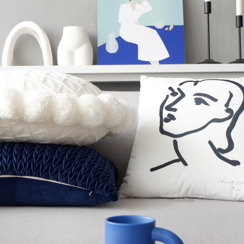 Color classification: dark blue blue braid stick figure girl white diamond ball ball round pillow
