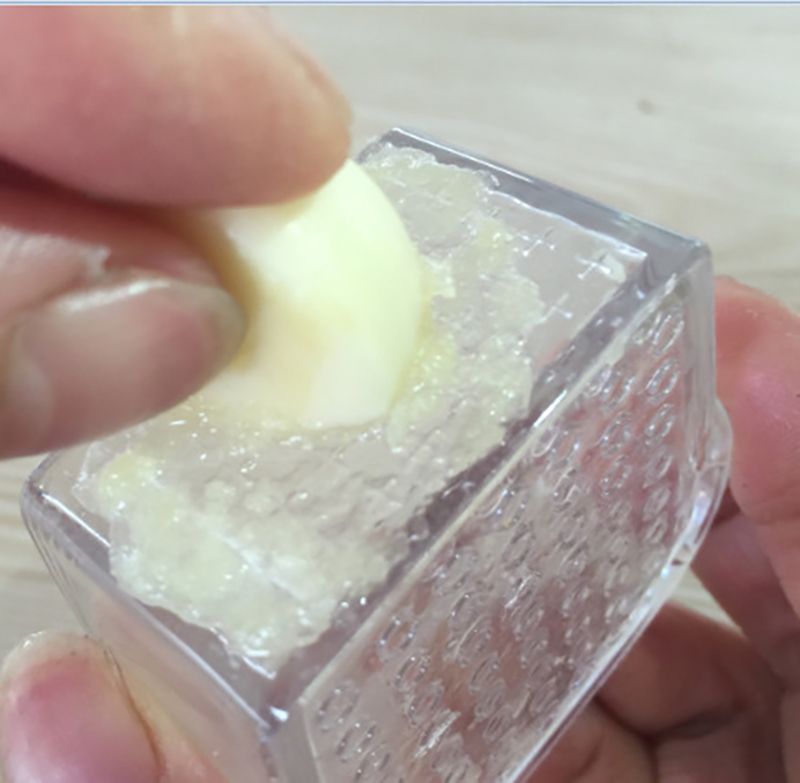 Press down on the lid, Deposits garlic into a clear storage bin