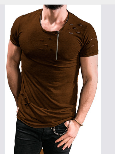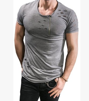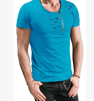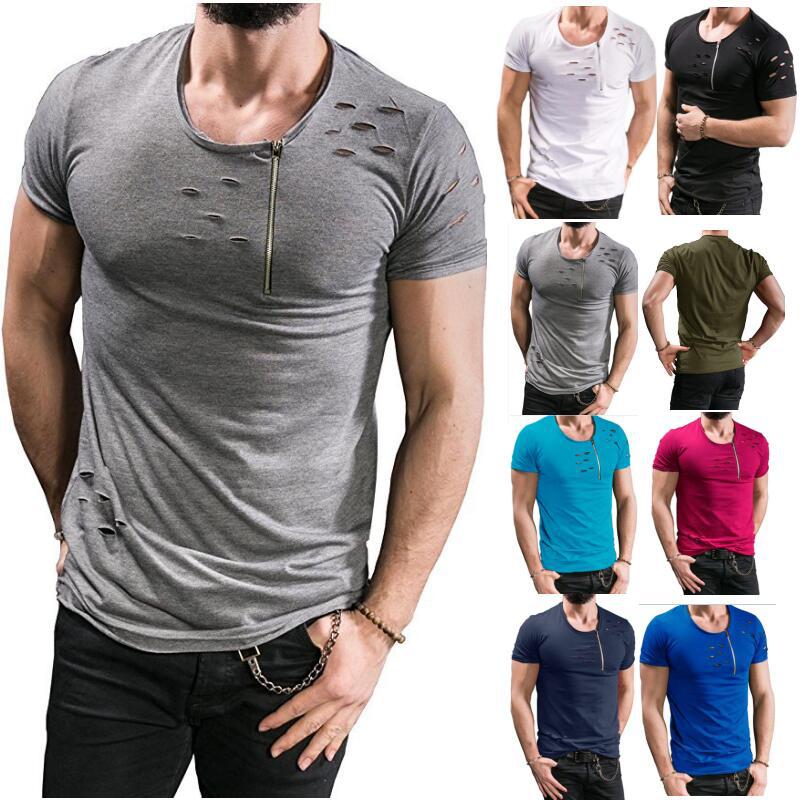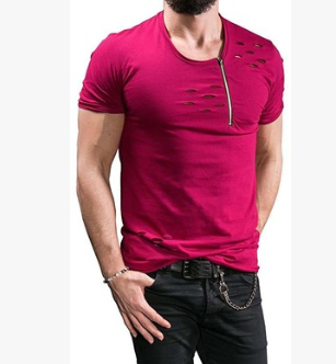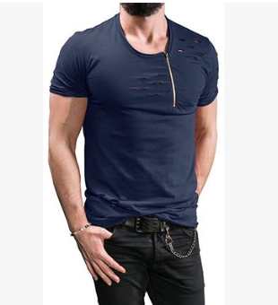 Men's Short-sleeved Zipper Decoration Torn T-shirt