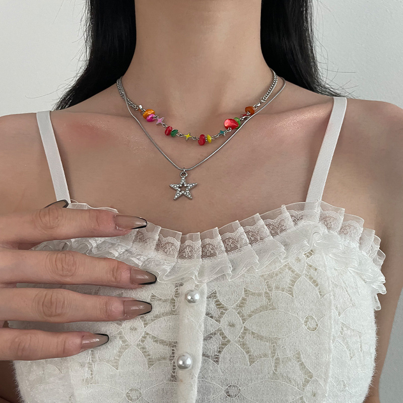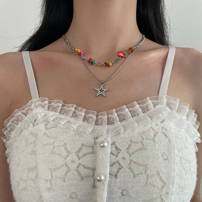 Color: colorful gravel double circles star necklace