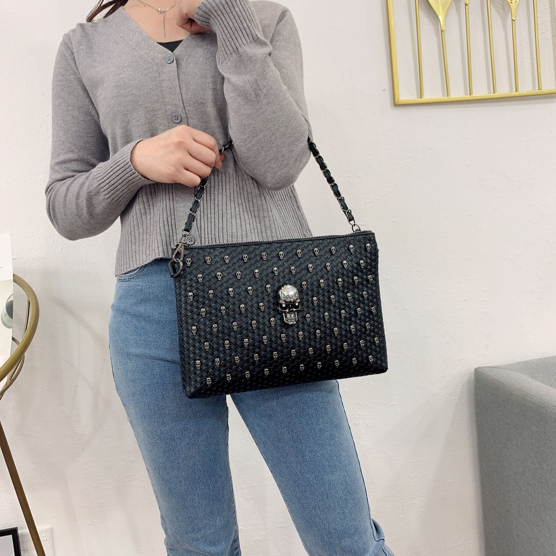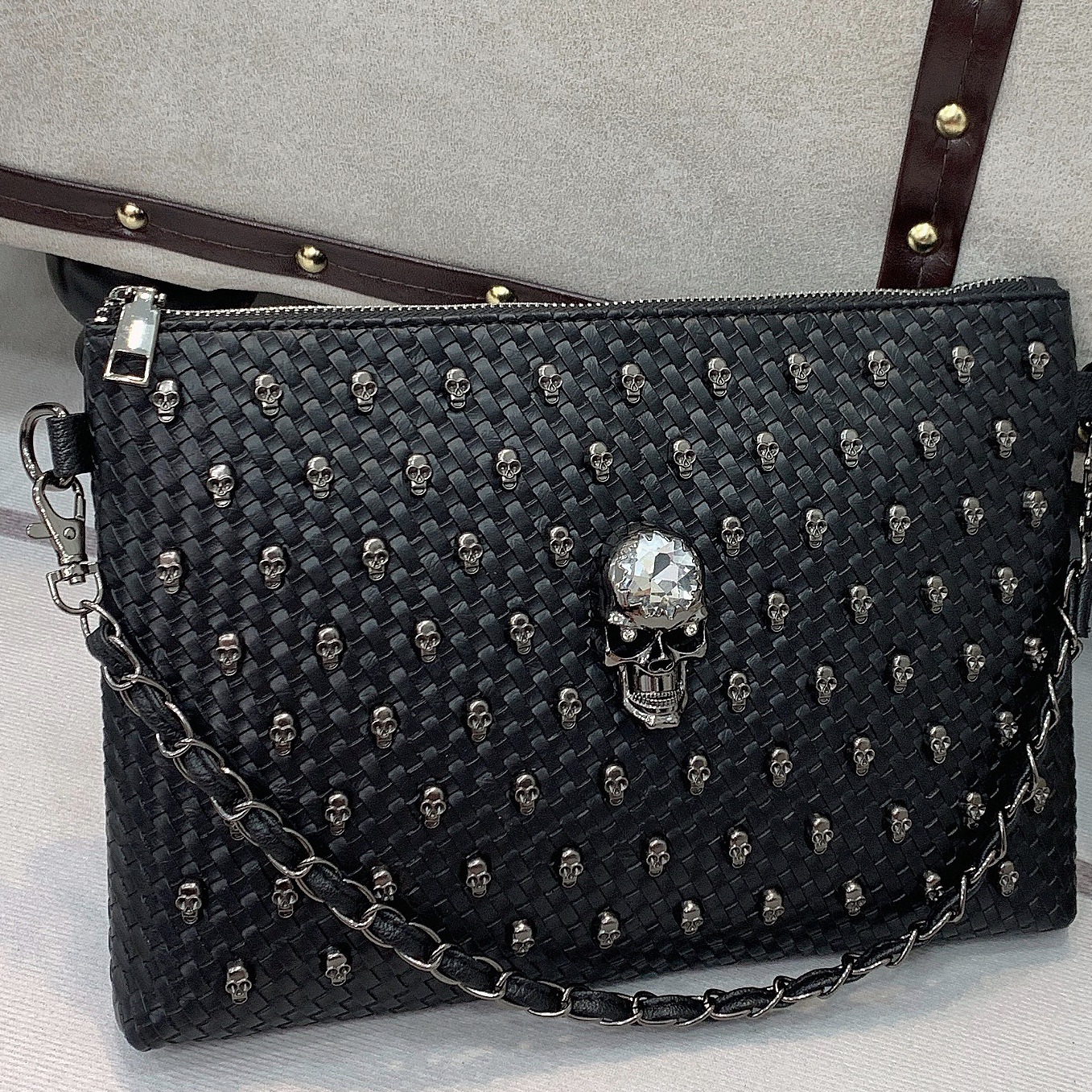 Product information :Color: blackMaterial: PUTrendy bag style: small square bagBag size: mediumPopular elements: rivets, skeletons, embossingMaterial: polyester.Packing list:Cross bag *1