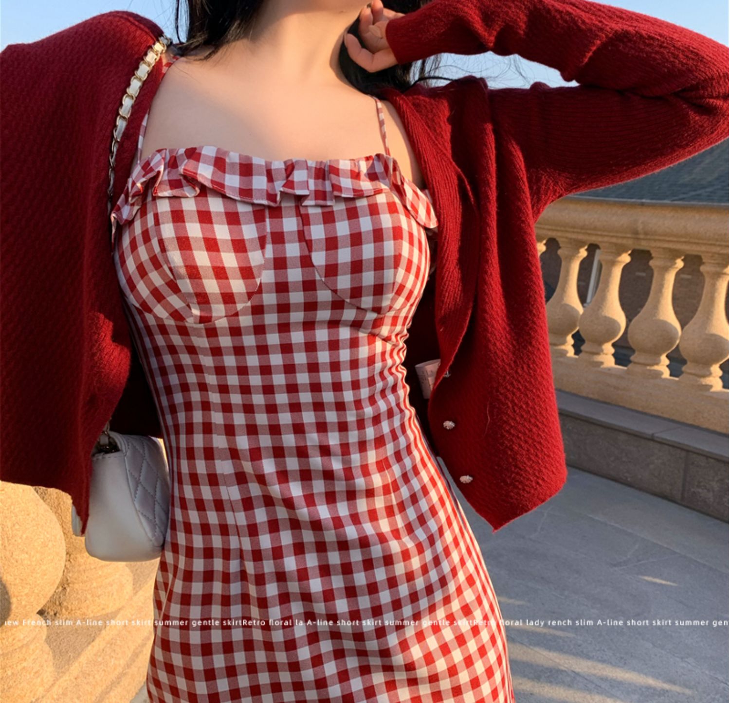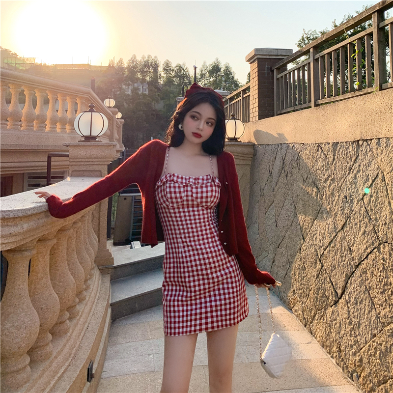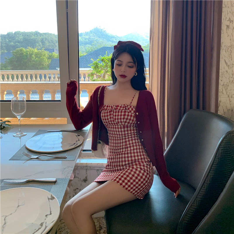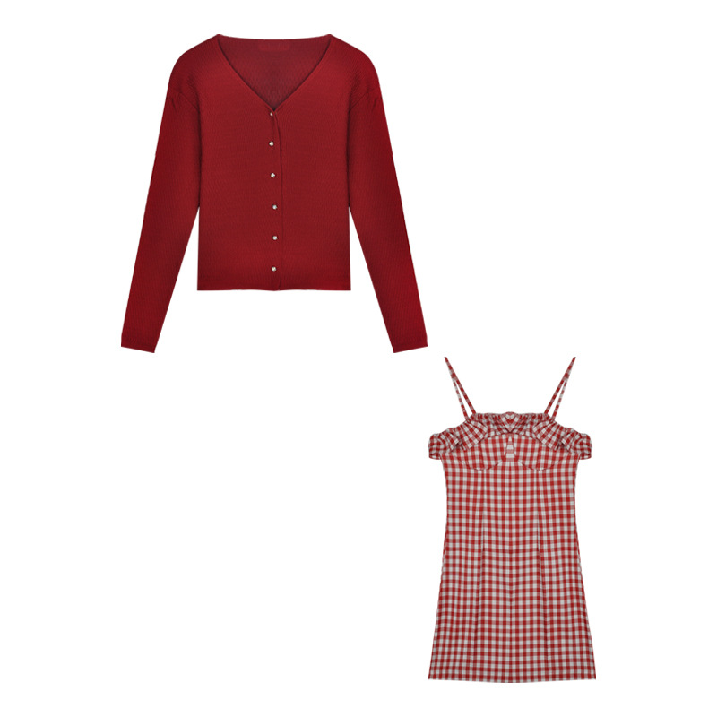 Color: Red cardigan, black cardigan, red checked suspender skirt, black checked suspender skirt