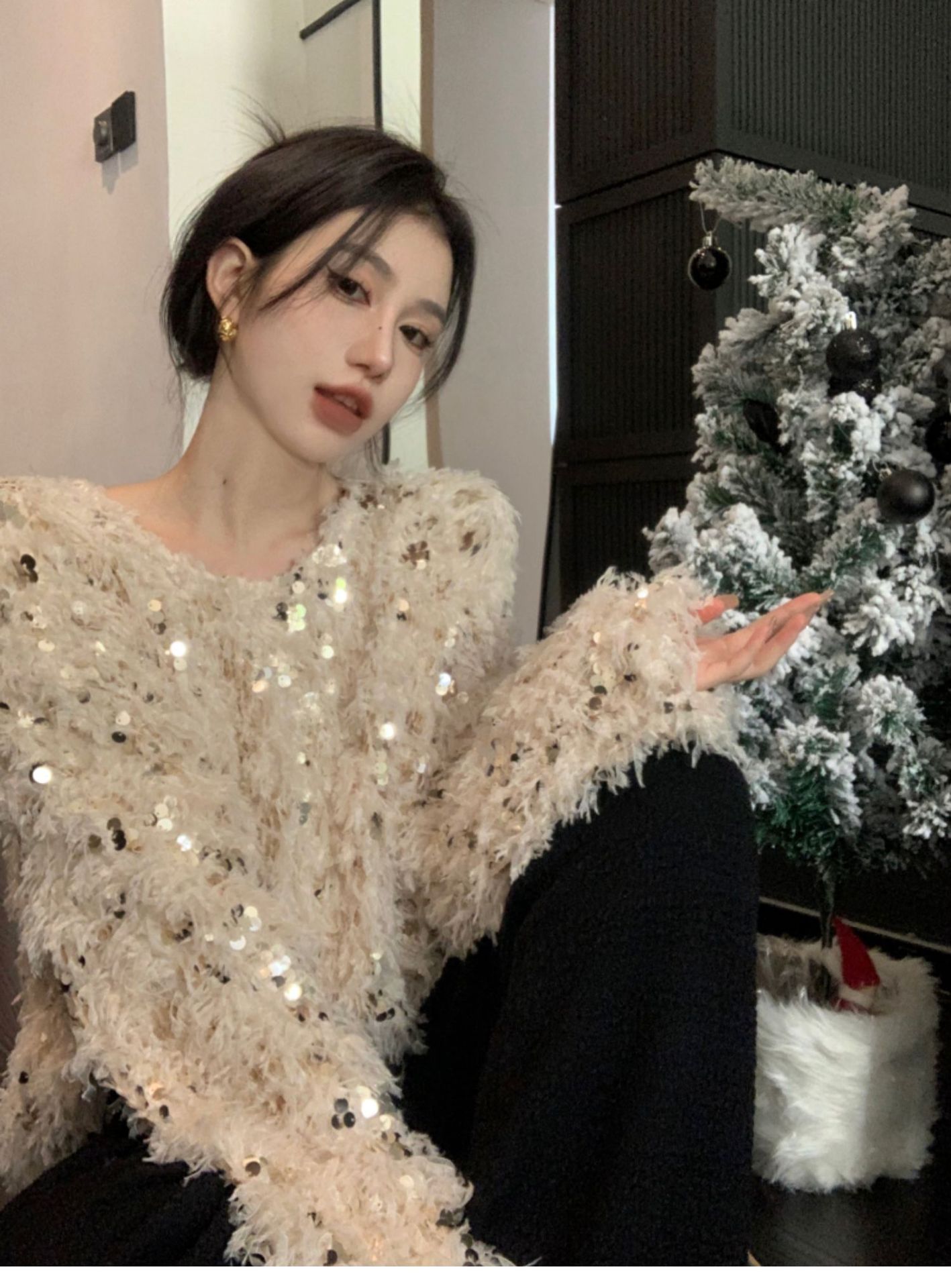 Product information: Pattern: solid color Color: beige sequins Size: free size Version: Loose Style type: temperament commute Sleeve type: Regular Wearing style: pullover Length: Short (40cm