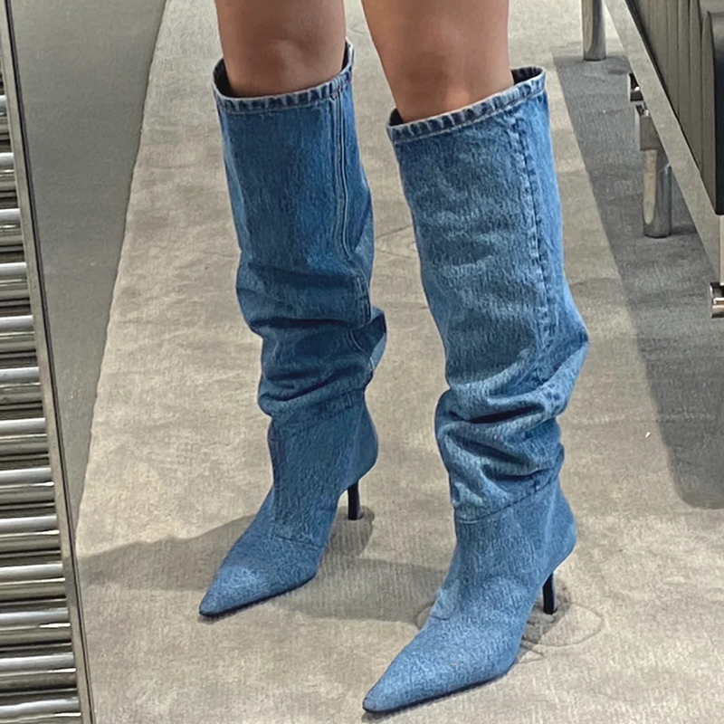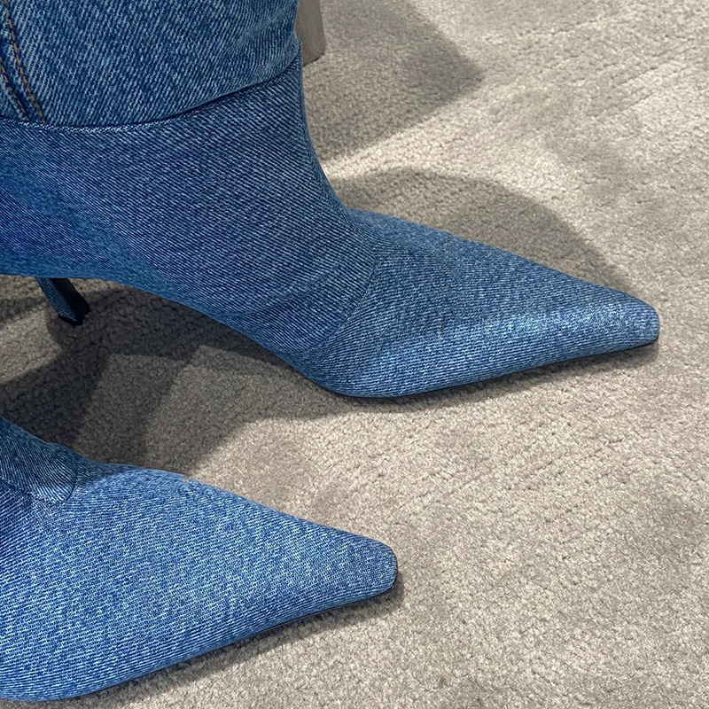 Product information :Color: denim blueHeel: Middle heel (3-5cm)High: high cylinderToe style: pointyUpper material: PUSize Information:Size: 35 36 37 38 39