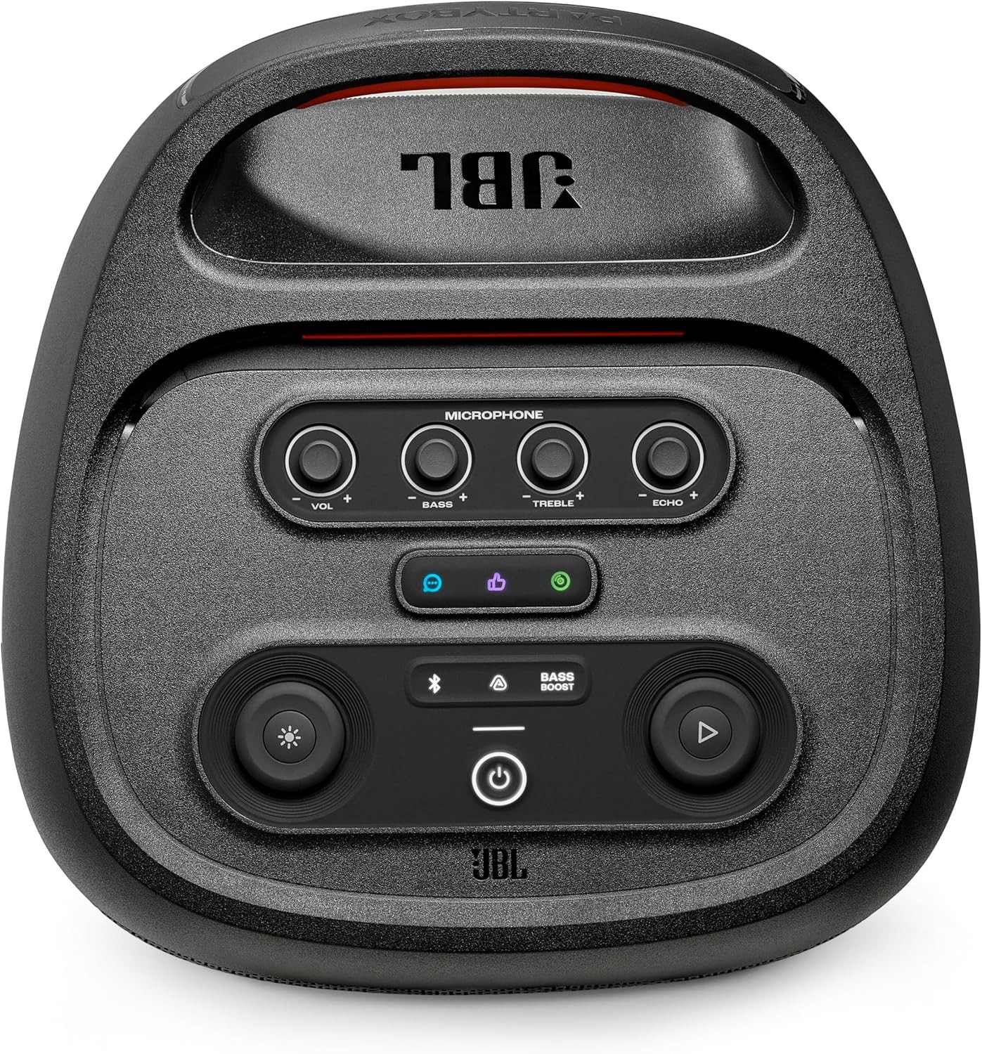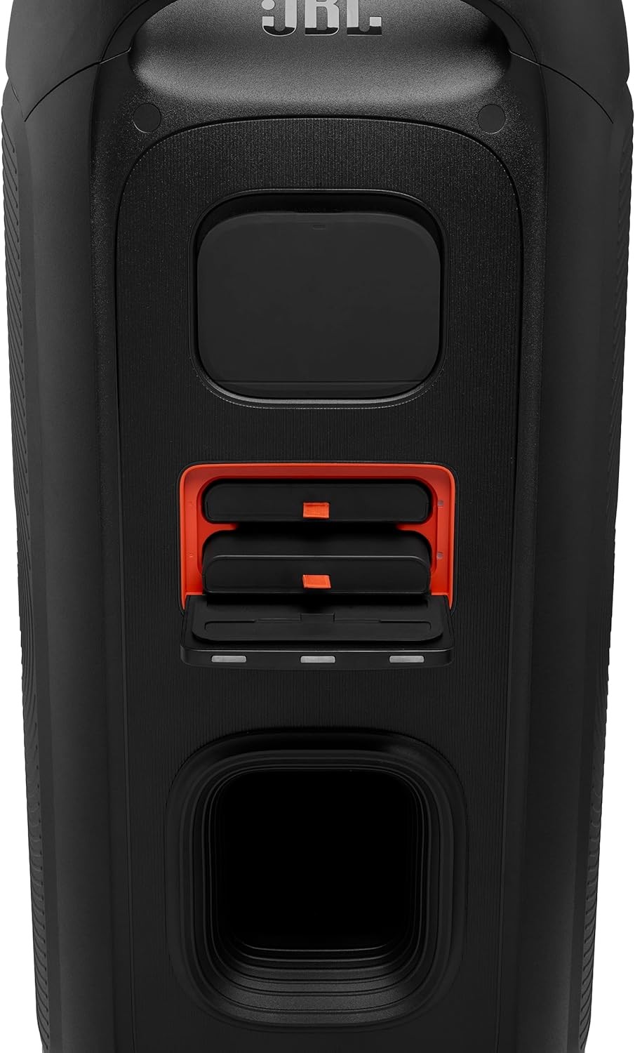 • عرض ضوئي ديناميكي: تتميز بلوحة إضاءة كاملة مع أضواء مرصعة بالنجوم قابلة للتخصيص، ومسارات ضوئية متدفقة، وتأثيرات وامضة تتزامن مع الموسيقى، ويمكن التحكم بها عبر تطبيق JBL PartyBox.