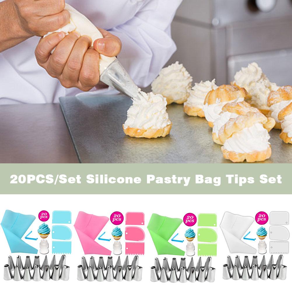 Material: stainless steel + plasticSize: see the picture belowA set contains: 14 decorating nozzles + 1 converter + 1 decorating bag + 1 pocket clip + 3 shaped cream scrapers