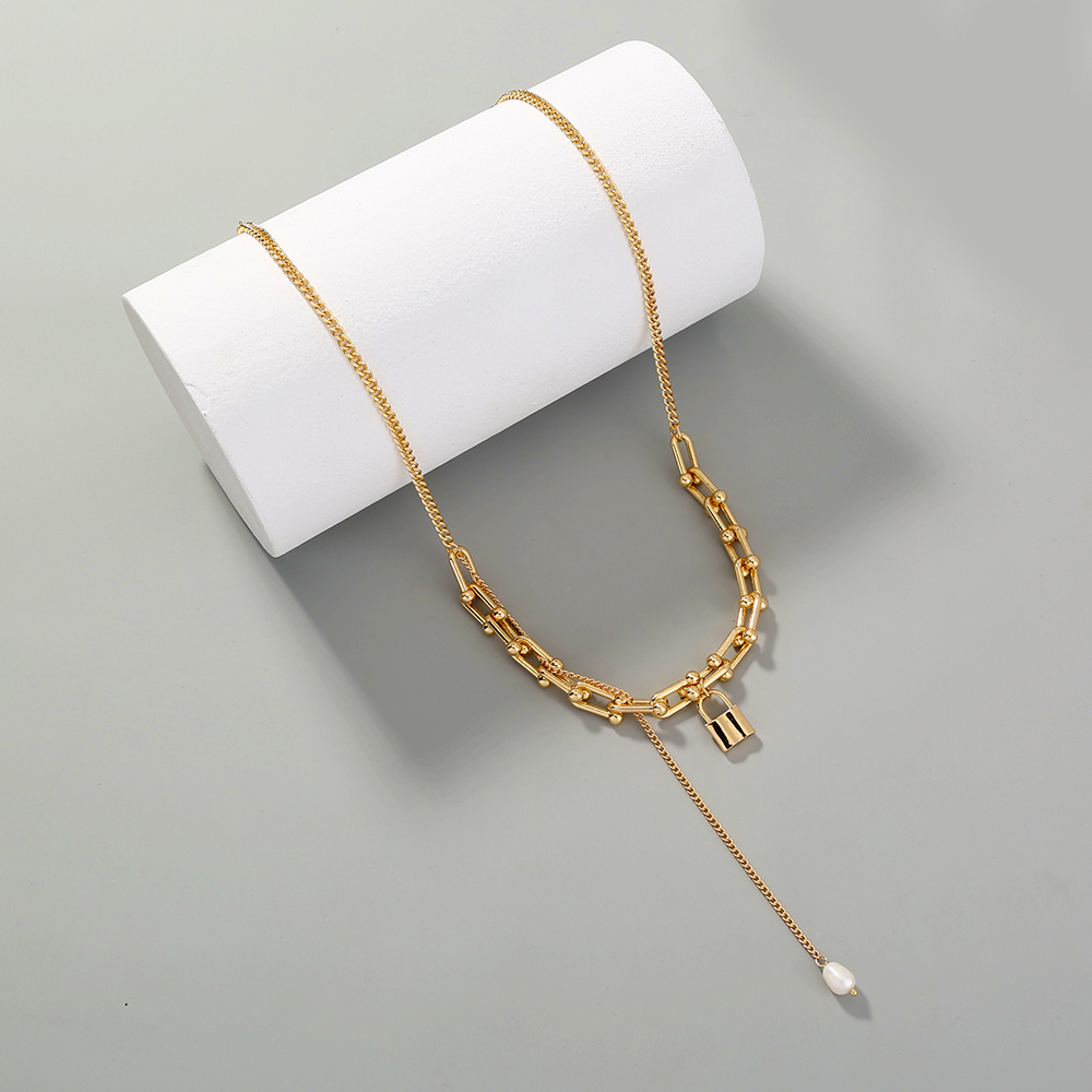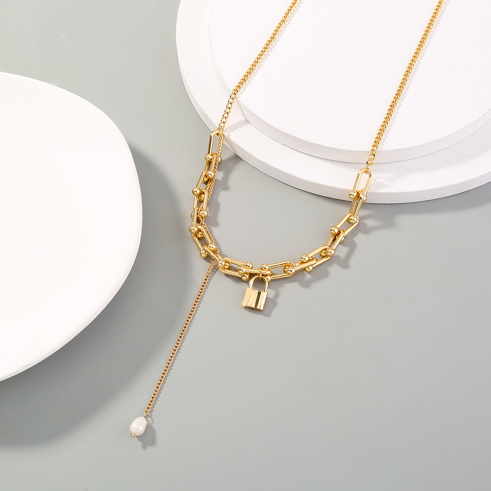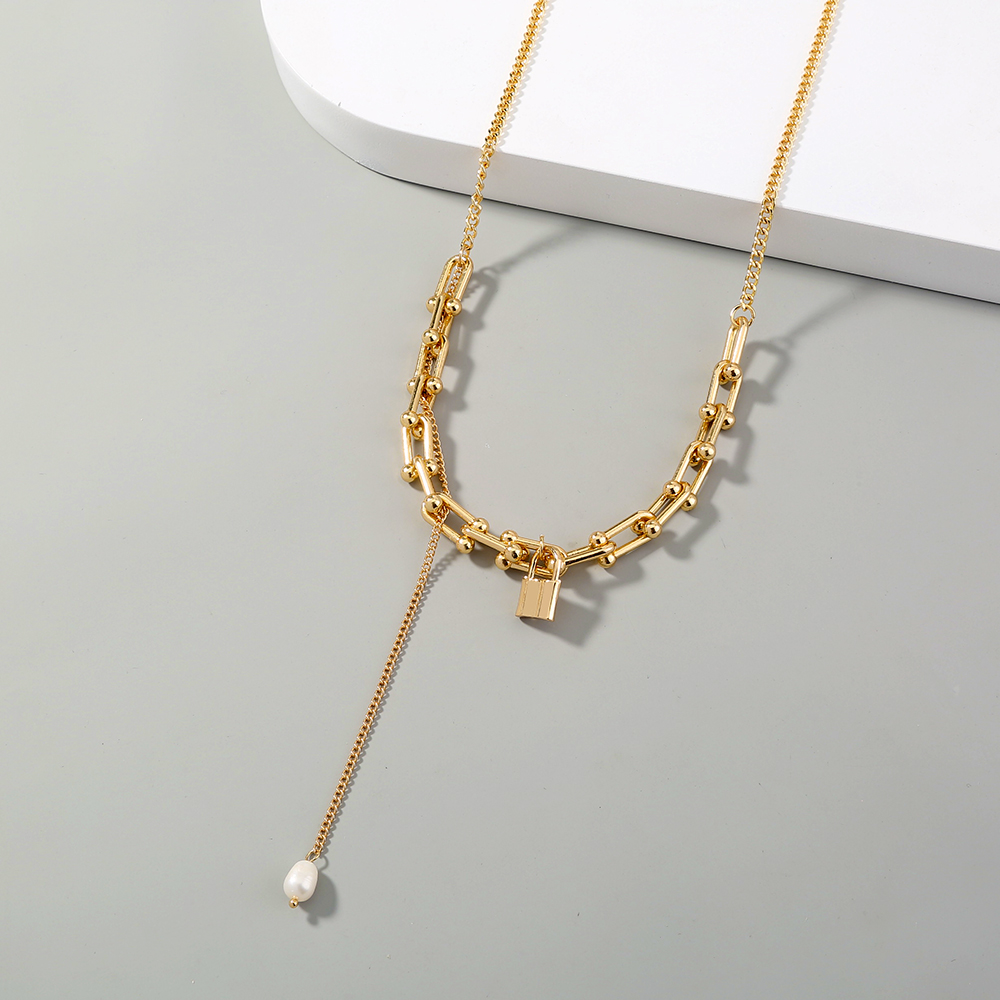 European and American cross-border fashion jewelry U-shaped chain lock-shaped single-layer necklace simple natural freshwater pearl long pendant necklace