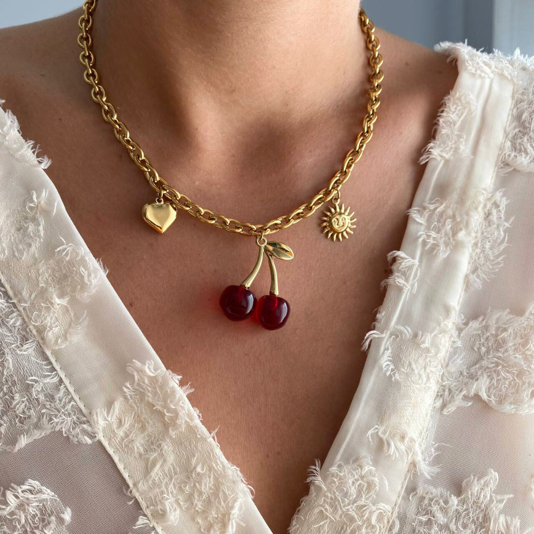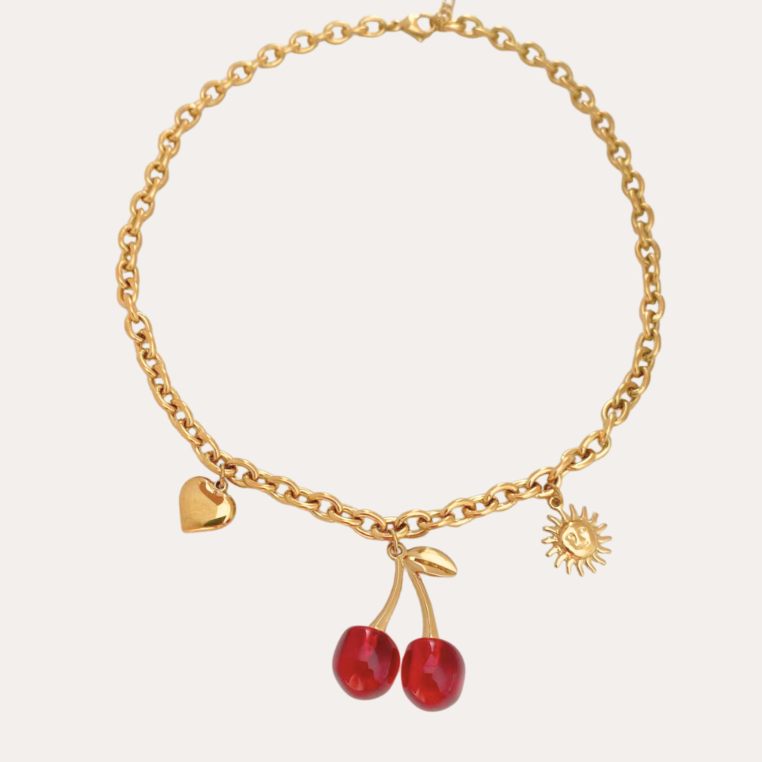 Product information:Color: gold necklaceApplicable people: womenPendant material: titanium steelChain style: Regular chainMaterial: titanium steelShape: fruitPopular elements: CherryStyle: Retro