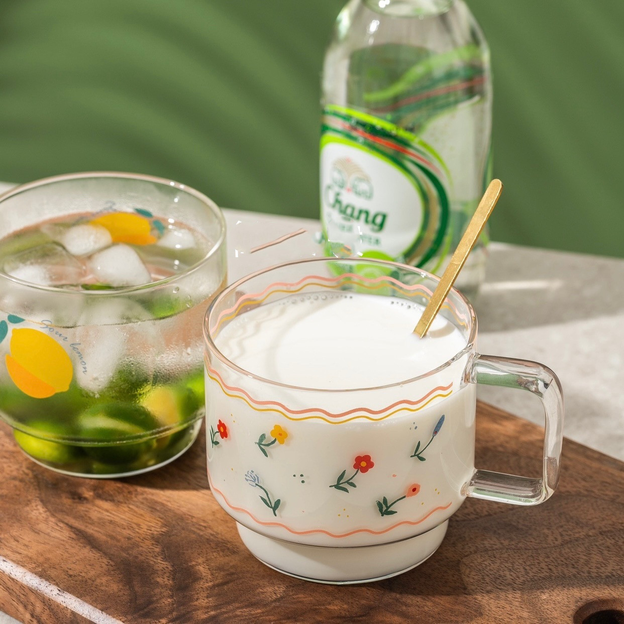 Product Information:Product Category: GlassFunction: environmental protection, high temperature resistancePattern: FloralShape: roundCup attachment: with handleCapacity: 201-300mlMaterial: heat-resistant glassPacking List:Glass*1