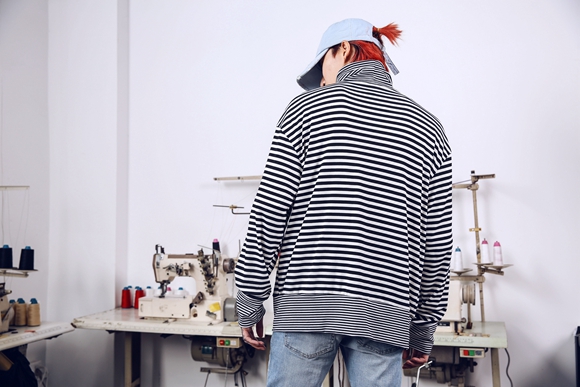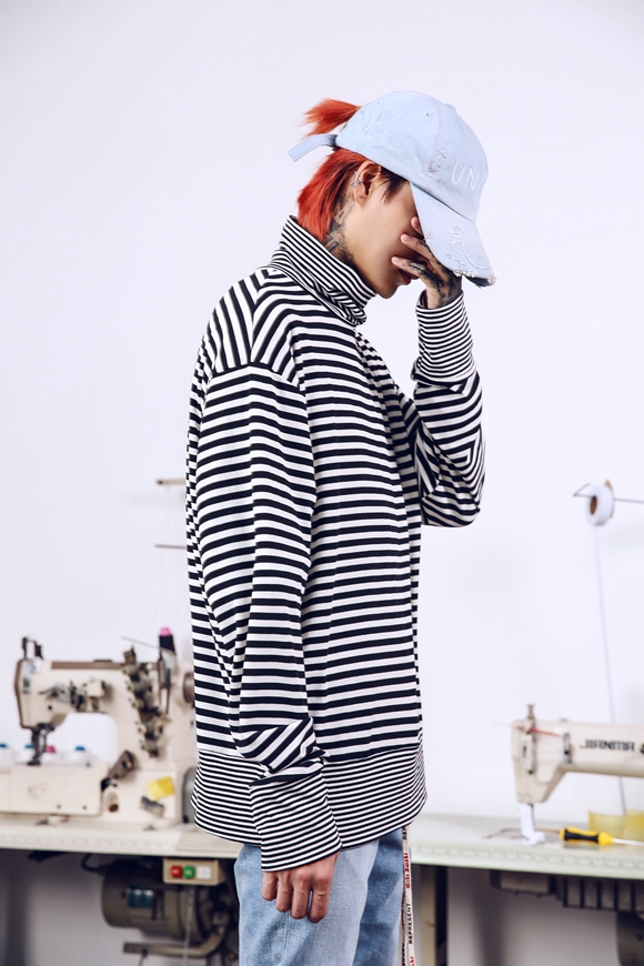 INS super fire high street hip hop street dance OVERSIZE loose high collar striped stitching bottom couple models long-sleeved T-shirt