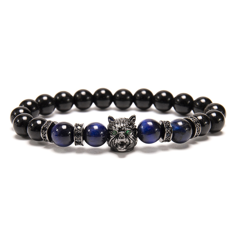 6#8mm Frosted Sapphire Blue Tiger Wolf Head Bracelet