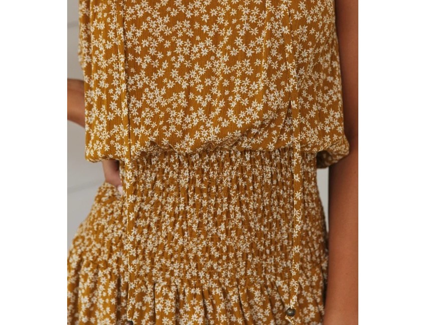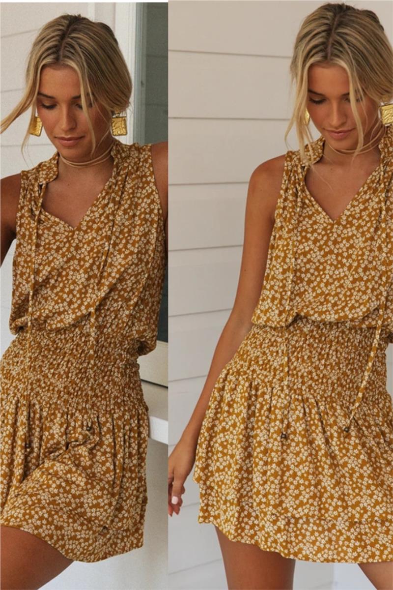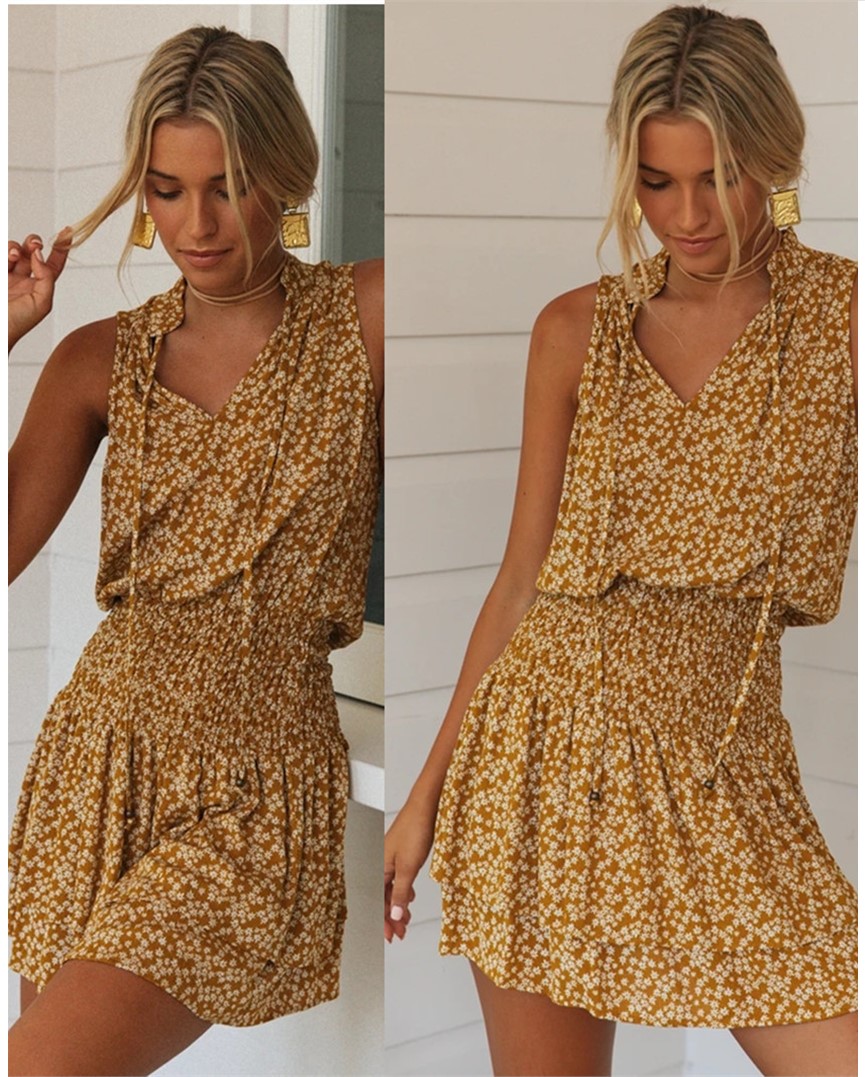Sleeve: Sleeveless Skirt length: short skirt Skirt type: big swing type Size: S M L XL Style: Street Collar type: V-neck Waist type: high waist Color classification: yellow Combination form: single piece