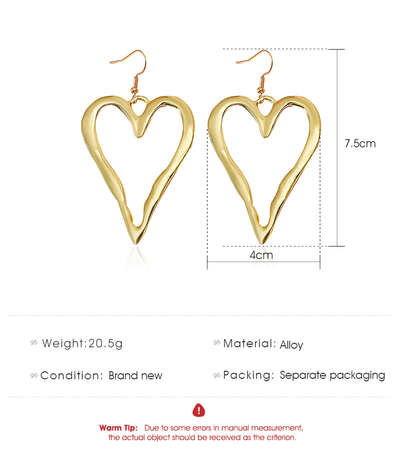 Product information:Material: AlloyStyle: Women'sShape: Heart shapeTreatment process: electroplatingColor: 01KC goldPopular elements: metal, retro, geometricPackage:Earring X1