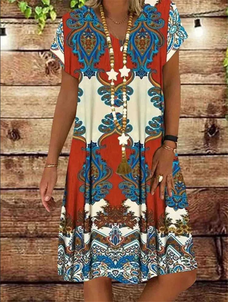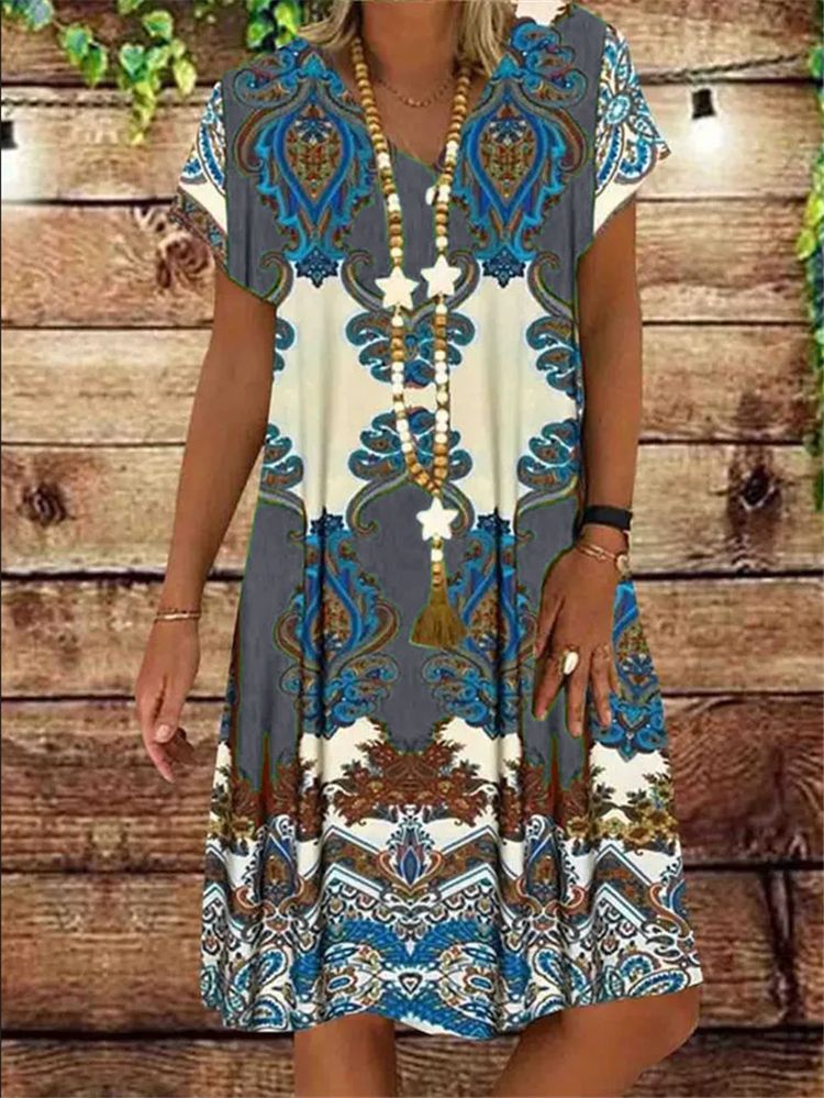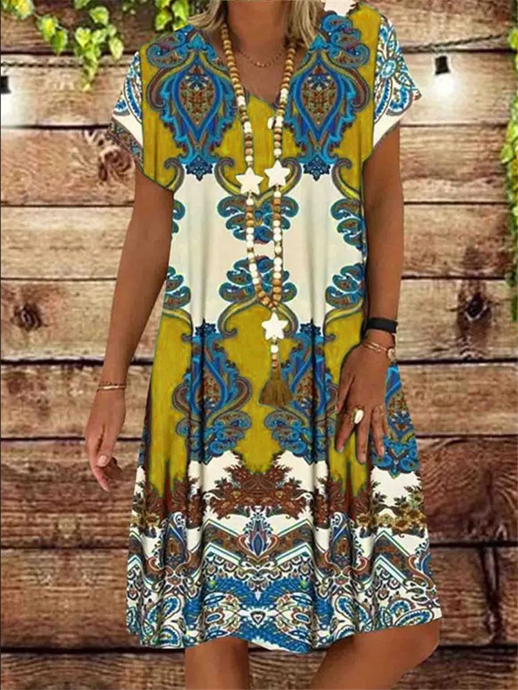 Printed short sleeve V-neck midi dress