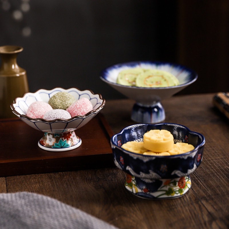 Color: 4.5-inch high foot plum-shaped dish-full color, 5-inch high foot cut edge bowl-blue line, 5-inch high foot lace bowl-small green flowers, 6-inch Japanese style tall bowl-blue color