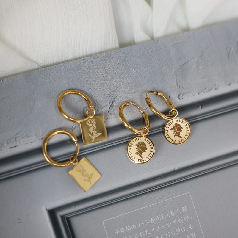 French Rose Flower Square Portrait Elizabeth Gold Coin Earrings Earrings