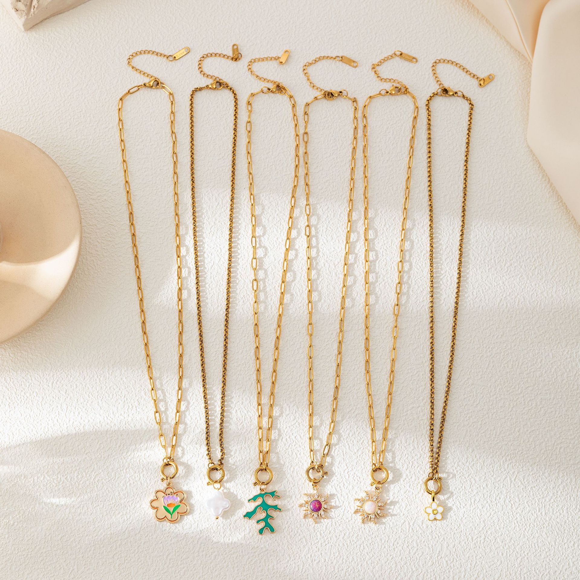 Color: purple sun (separate pendant), coral branch (separate pendant), flower (separate pendant), White small flower (separate pendant), Cross shell (separate pendant), white Sun (separate pendant), clip open end ring (separate chain), O-ring open chain (separate chain)
