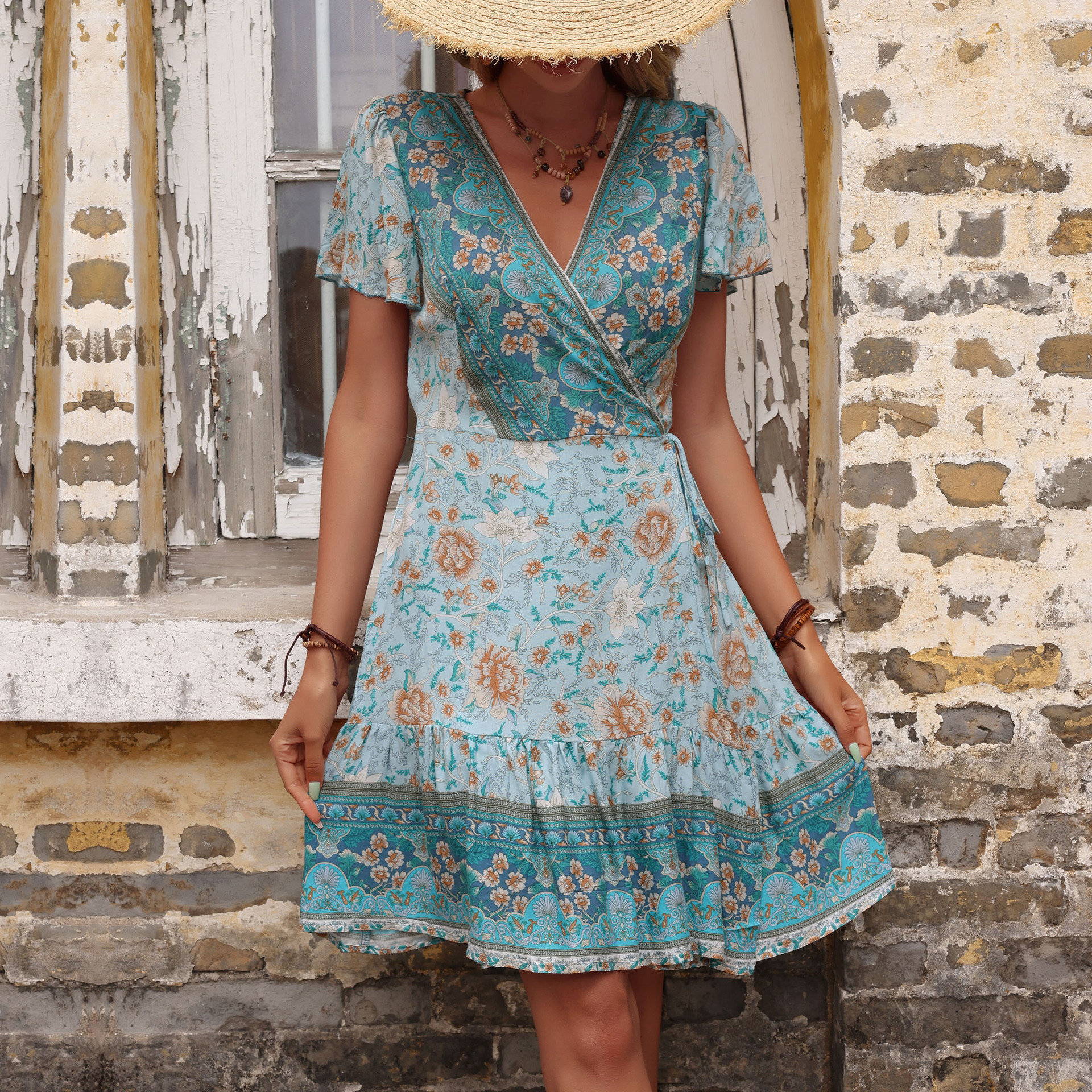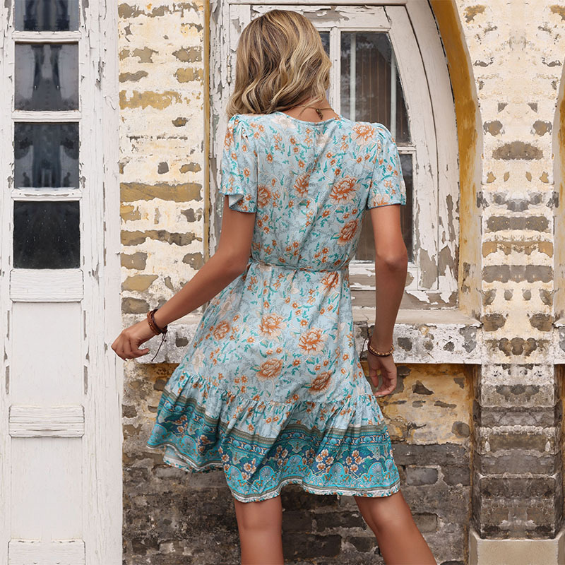 Product information: Pattern: Printing Color: green Size: S,M,L,XL Fabric name: Cotton Sleeve type: bell sleeve Sleeve length: short sleeve Skirt Category: Dress