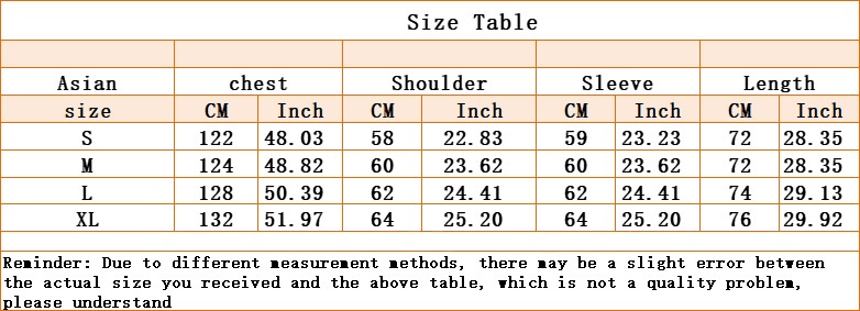 1. Asian sizes are 1 to 2 sizes smaller than European and American people. Choose the larger size if your size between two sizes. Please allow 2-3cm differences due to manual measurement. 2. Please check the size chart carefully before you buy the item, if you don't know how to choose size, please contact our customer service. 3.As you know, the different computers display colors differently, the color of the actual item may vary slightly from the following images.