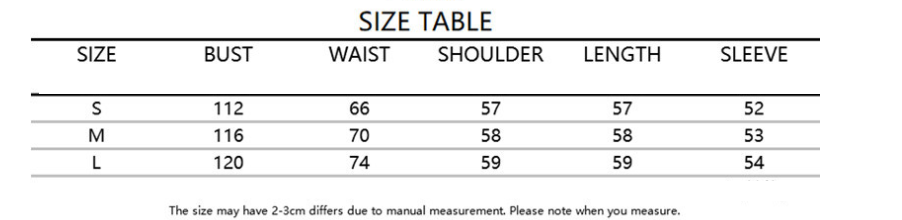 | size | Bust | The waist | Shoulder width | Clothing length | Sleeve length |