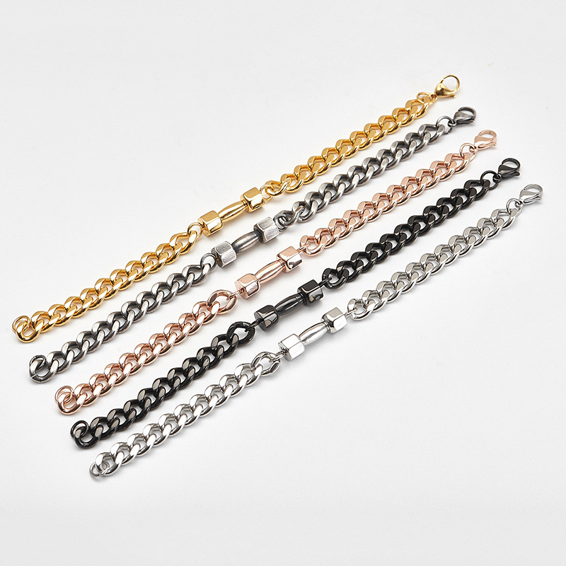 Product Details:Material: titanium steelStyle: Men'sColor: black, rose gold, steel color, gold, retro colorPopular elements: chainSize information:Size: Chain length: 21cm Small barbell: 26mmPackage Contents:Bracelet X1