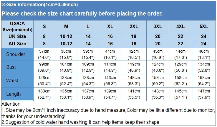 2. Please check the size chart carefully before you buy the item, if you don't know how to choose size, please contact our customer service.