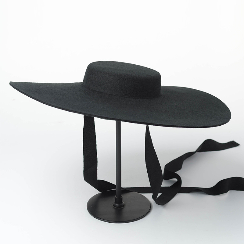 Product category: big brim hatApplicable gender: femaleMaterial: woolWeaving method: warp knittingColour: BlackEaves shape: flat eaves