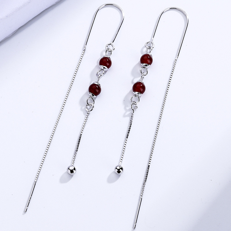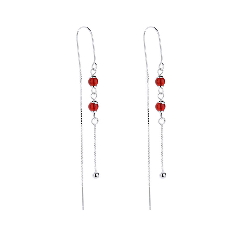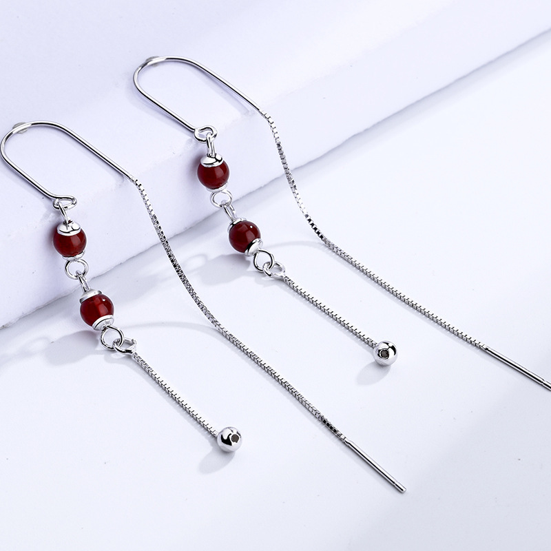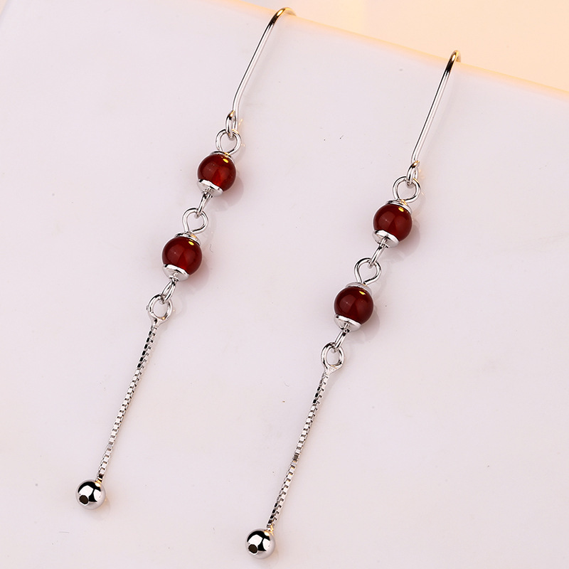 Pure silver earrings natural red agate female simple long tassel earrings Japanese and Korean fashion anti-lost earrings