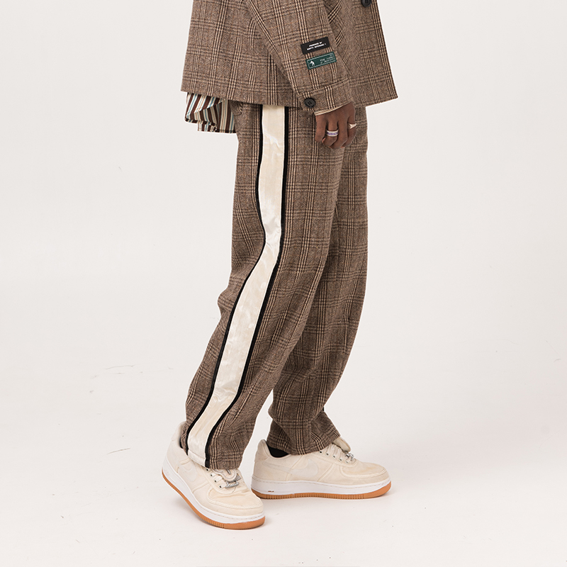 Men's Coffee Plaid Vintage Suit Velvet Trousers