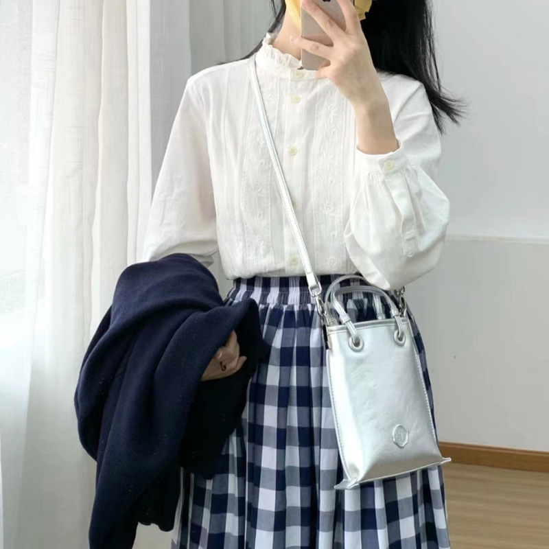 Color: shirt, navy blue cardigan (free size), blue and white tartan skirt