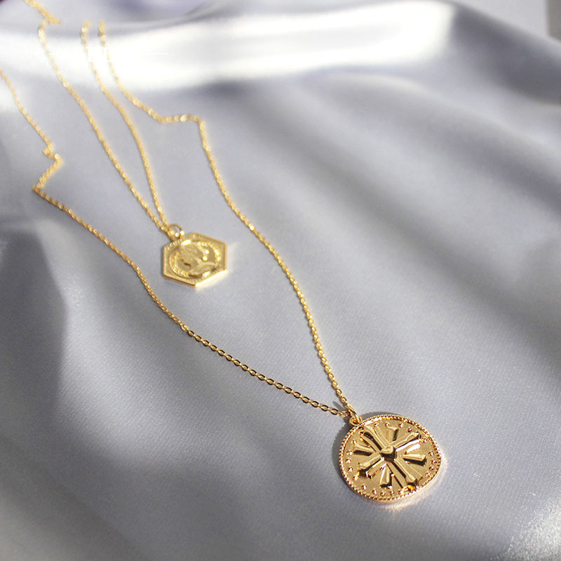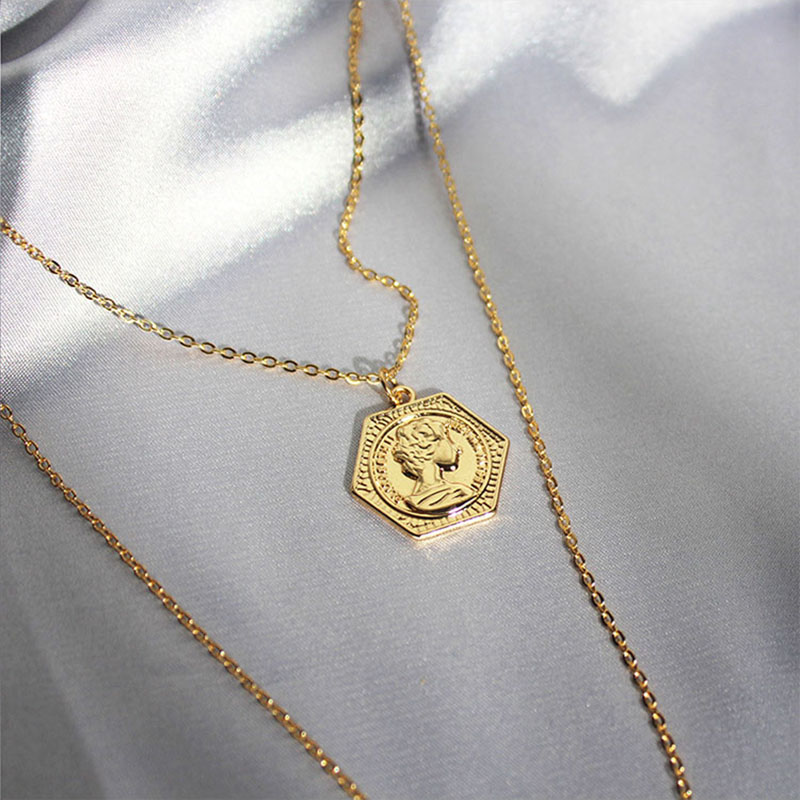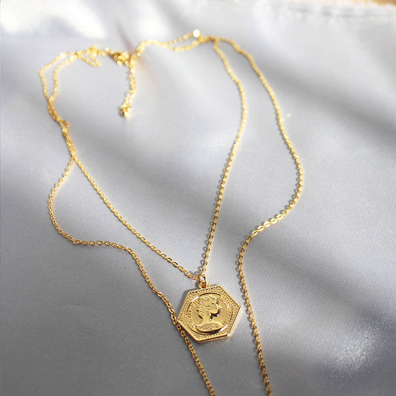 Vintage Coin Queen Head Cross Relief Long Necklace