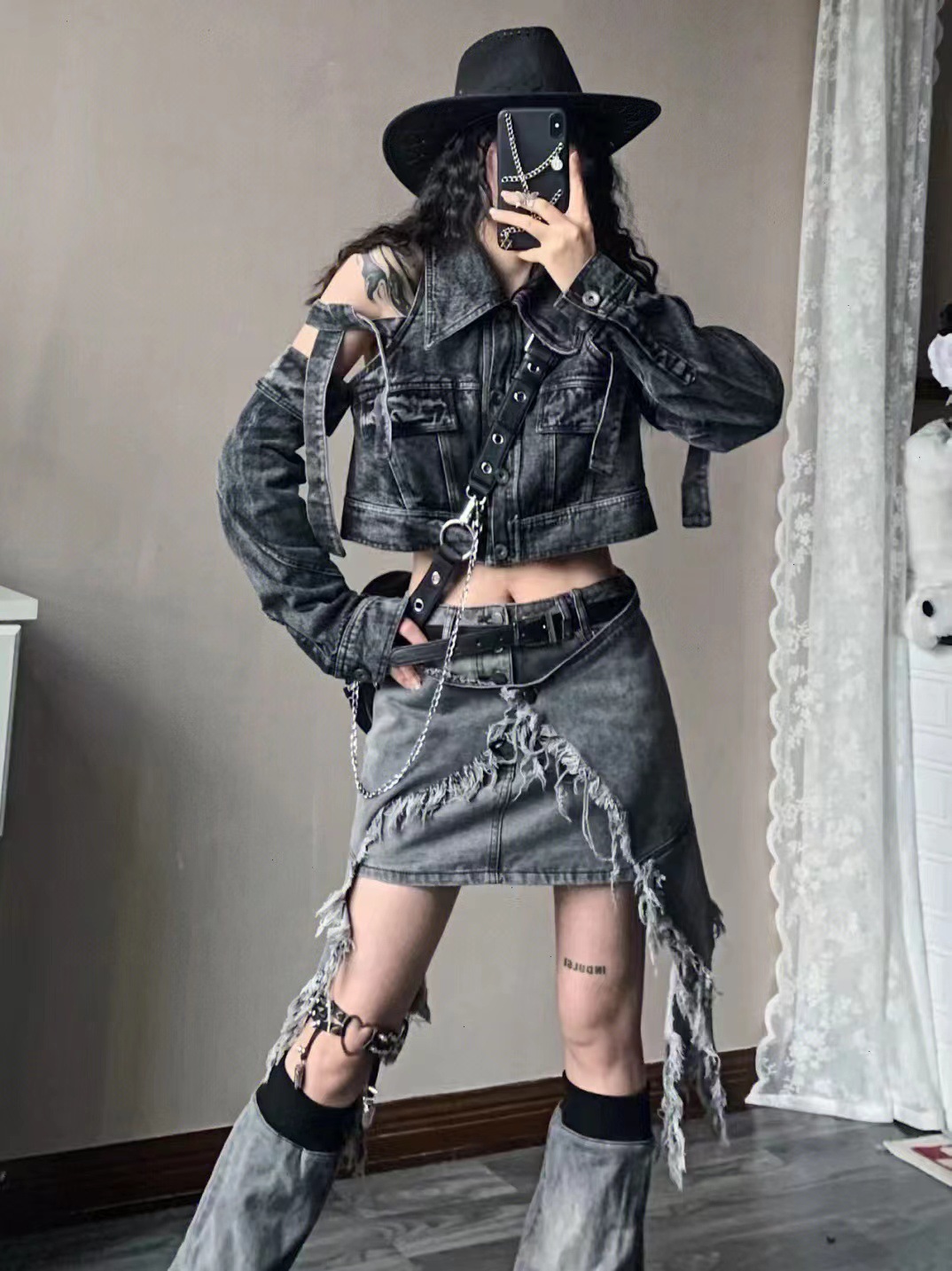 Product information:Pattern: Burr Fabric name: denim Color: Picture color Elasticity: inelastic Main fabric composition: Cotton Size: S,M,L,XL Skirt length: short skirt
