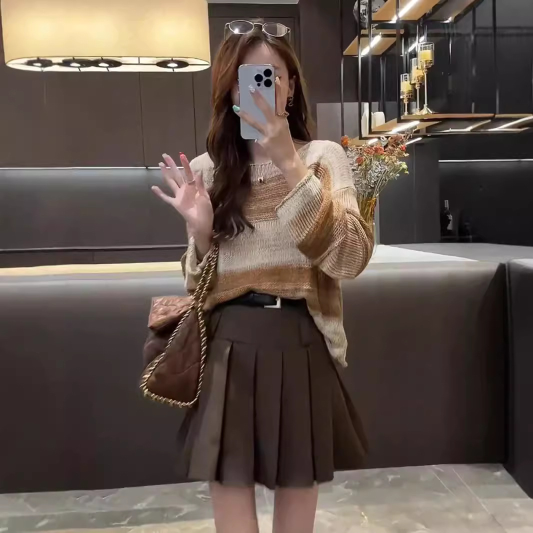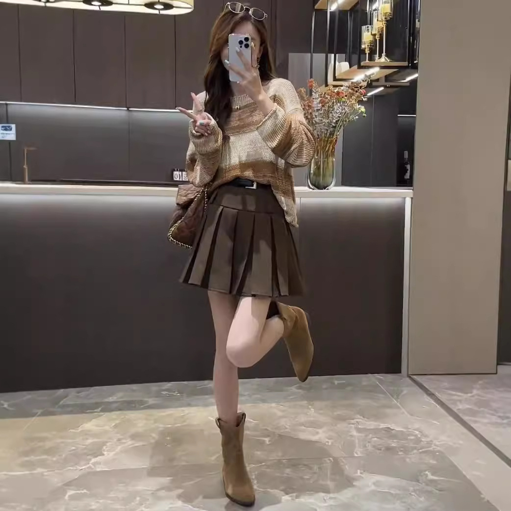 Product information:Color: Chuck, brown pleated skirt, two-piece set Main fabric composition: Polyester Fiber Size: S,M,L,XL Applicable Gender: Female Skirt length: short skirt Sleeve length: long sleeve