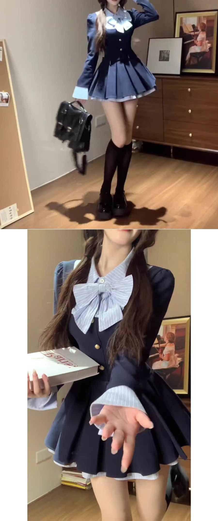 Color: navy blue fake two pieces dress [send bow belt]]]]