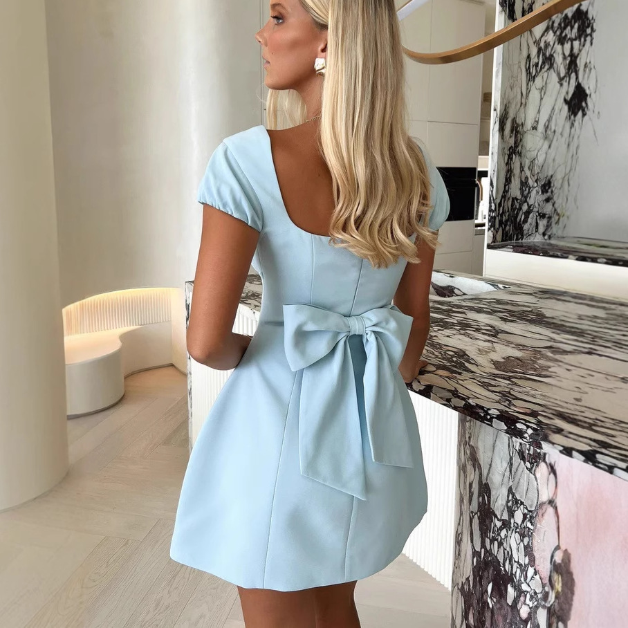 Product information:Pattern: Bow Color: White Waist type: high waist Size: S,M,L Skirt length: short skirt Fabric name: Polyester Sleeve length: short sleeve Skirt Category: Dress
