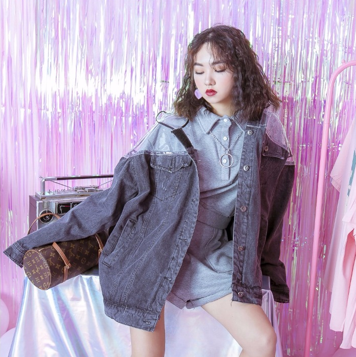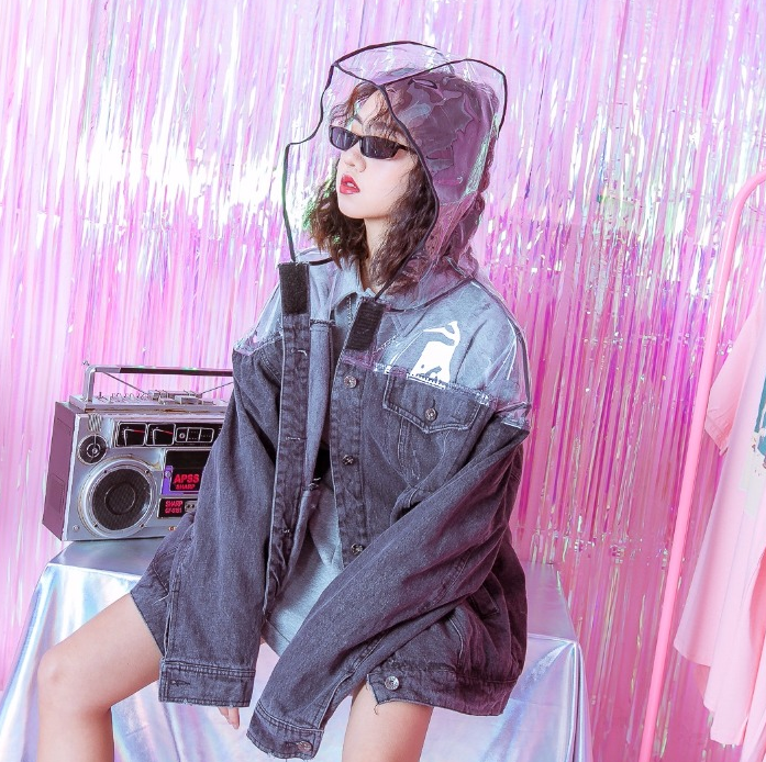 European and American hip hop retro worn BF wind cut transparent raincoat hooded stitching loose denim jacket